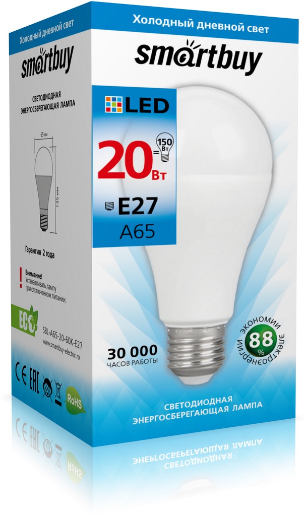 Светодиодная лампа Smartbuy SBL-A65-20-60K-E27 холодный дневной свет